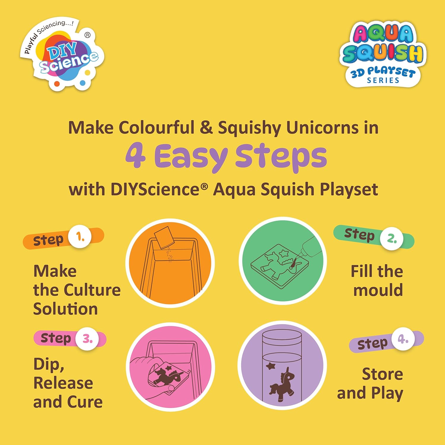 DIYScience Unicorn Paradise Aqua Squish Kit is a fun and magical toy set that lets you create colorful, soft, and squishy shapes in just minutes. Step into a world of magic and wonder with unicorn paradise it offers an unforgettable blend of learning and fun, The Aqua Squish Playset is a creative and sensory toy that Offers a fun, hands-on activity that combines creativity with scientific learning, making it an ideal gift for curious young minds. Designed for easy use with step-by-step instructions and demo video support. Aqua Squish contains colorful non-toxic and eco-friendly materials that are safe for kids so that kids can design for hours of imaginative fun. The playset includes Squishy Goo, Unicorn Molds, Culture Powder, Solution Try, Display Jar, and Instruction Manual for designing magical squishes and creating the mentioned designs, encouraging kids to tactile exploration and fine motor skills development. Make Your Squishy Baby Unicorns in 4 Easy Steps: Prepare the culture solution. Fill the molds with vibrant squishy goo. Dip, release, and cure the baby unicorns. Store and play with your 3D baby unicorns. Key Features: Safe and Non-Toxic: All materials included are 100% safe for children, ensuring their safety and worry-free crafting experience. Quick Transformation: The squishy baby unicorns form within minutes, providing immediate satisfaction and encouraging continued play. Not Required Any Sharp Tools: The kit has been designed with child safety in mind, eliminating the need for all those sharp tools. Educational Value: Allow kids to explore concepts like chemical reactions, states of matter, polymer science, mixing, and measuring. Note: Please note that the baby unicorns retain their form only while submerged in water.