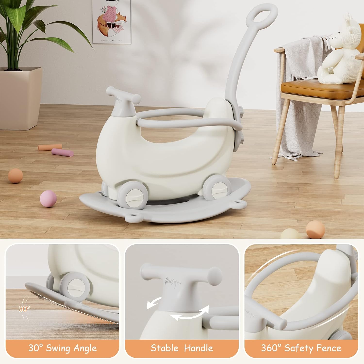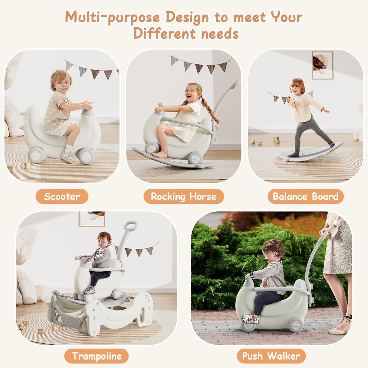 BanaSuper 5-in-1 Kids Rocking Horse Grey Multifunctional Ride-on Toy for Toddlers Trampoline Push Walker Scooter Balance Board Indoor and Outdoor Play Gym Gift for Boys and Girls