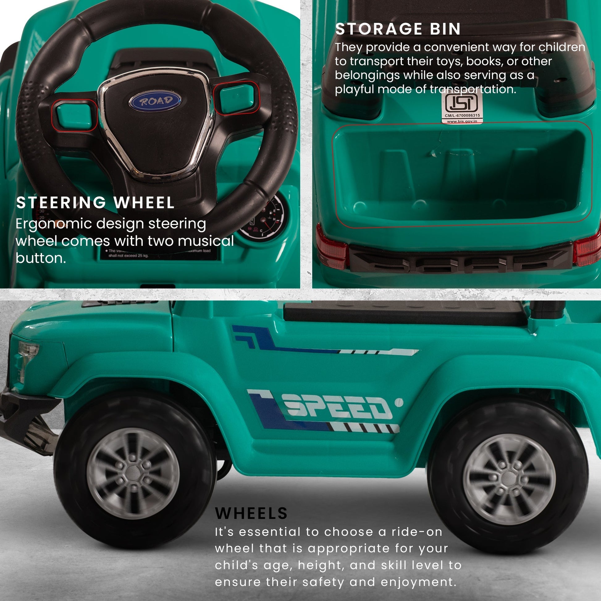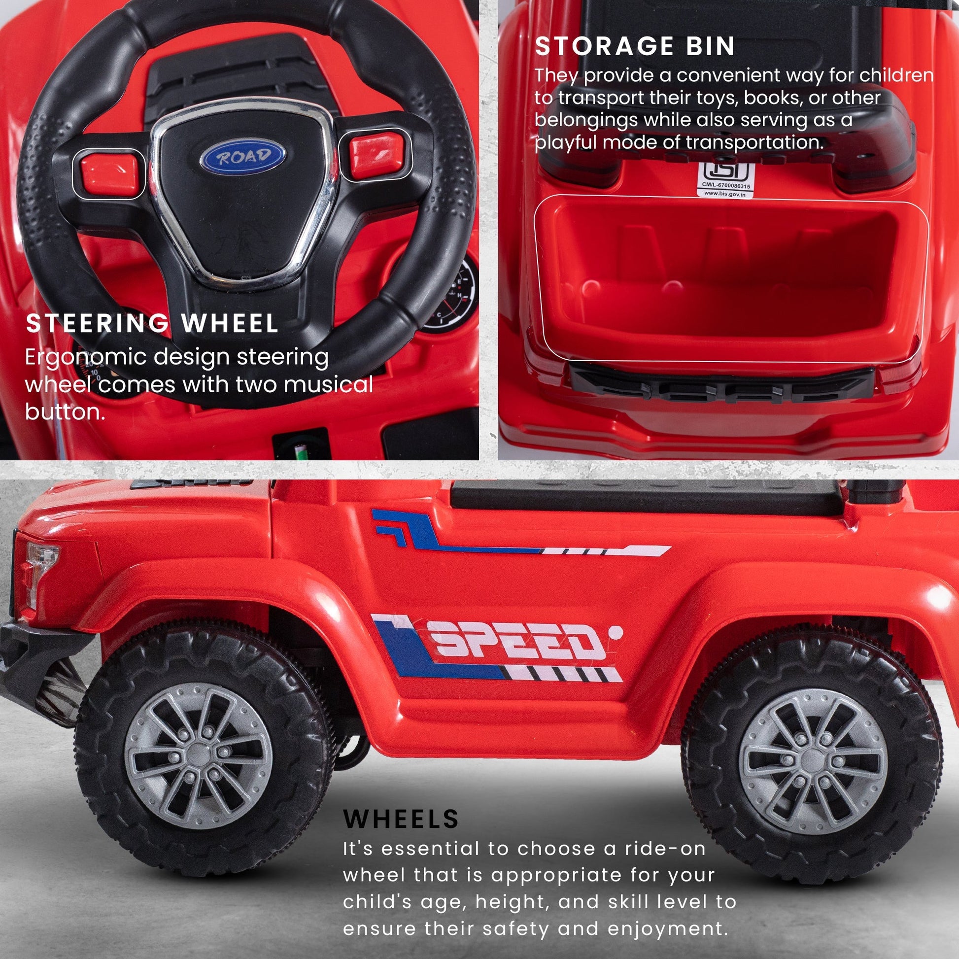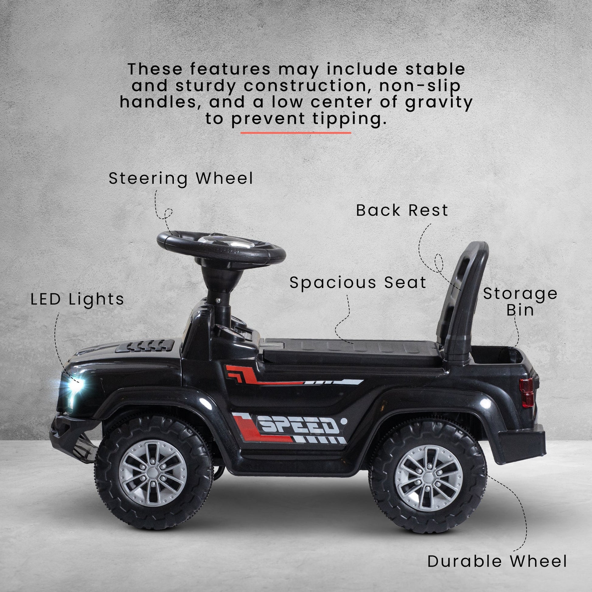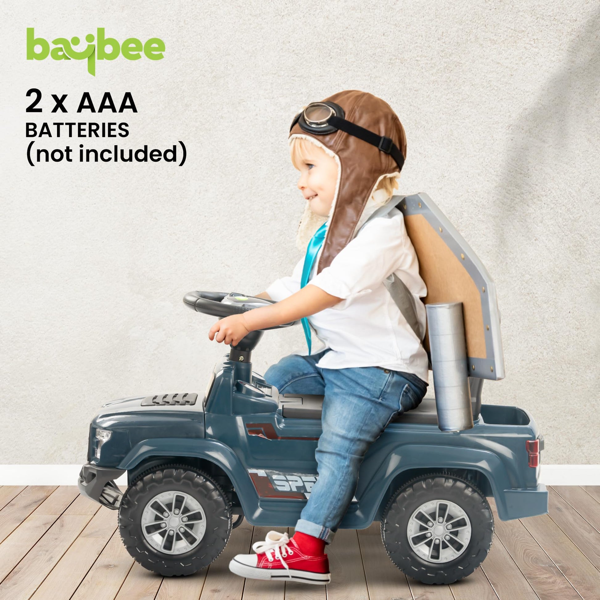 Explore endless possibilities with the Baybee Push Ride on Baby Jeep! Equipped with LED lights and a storage bin, this toy is perfect for imaginative play. Encourage outdoor activity and development of gross motor skills. Let your child's imagination run wild with the Baybee Push Ride on Baby Jeep!