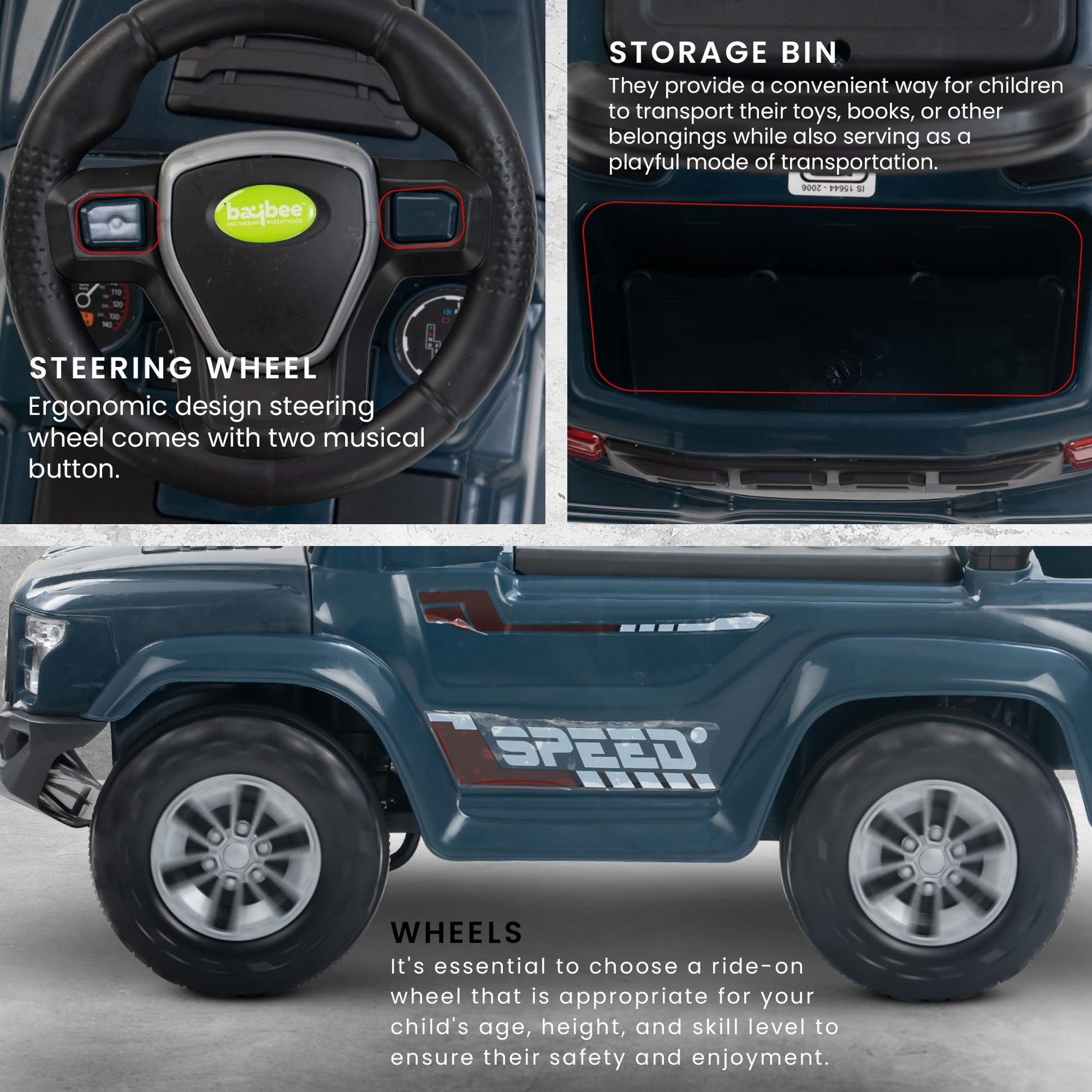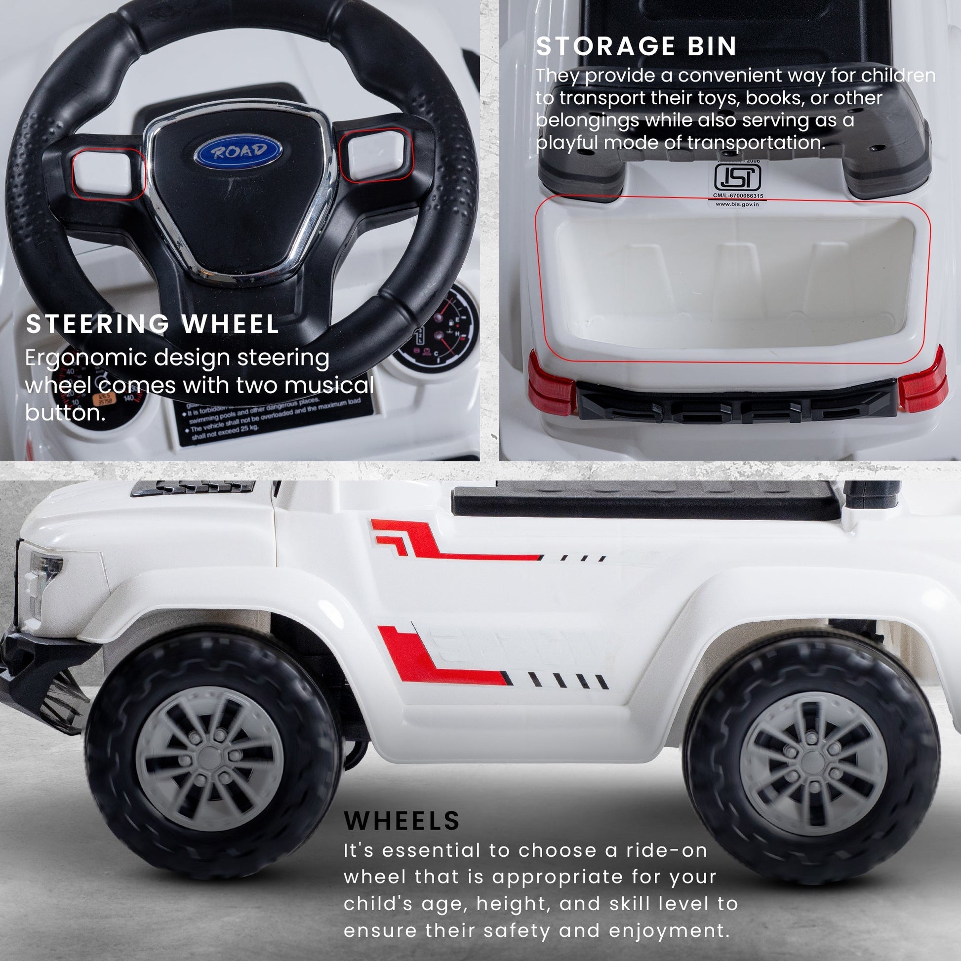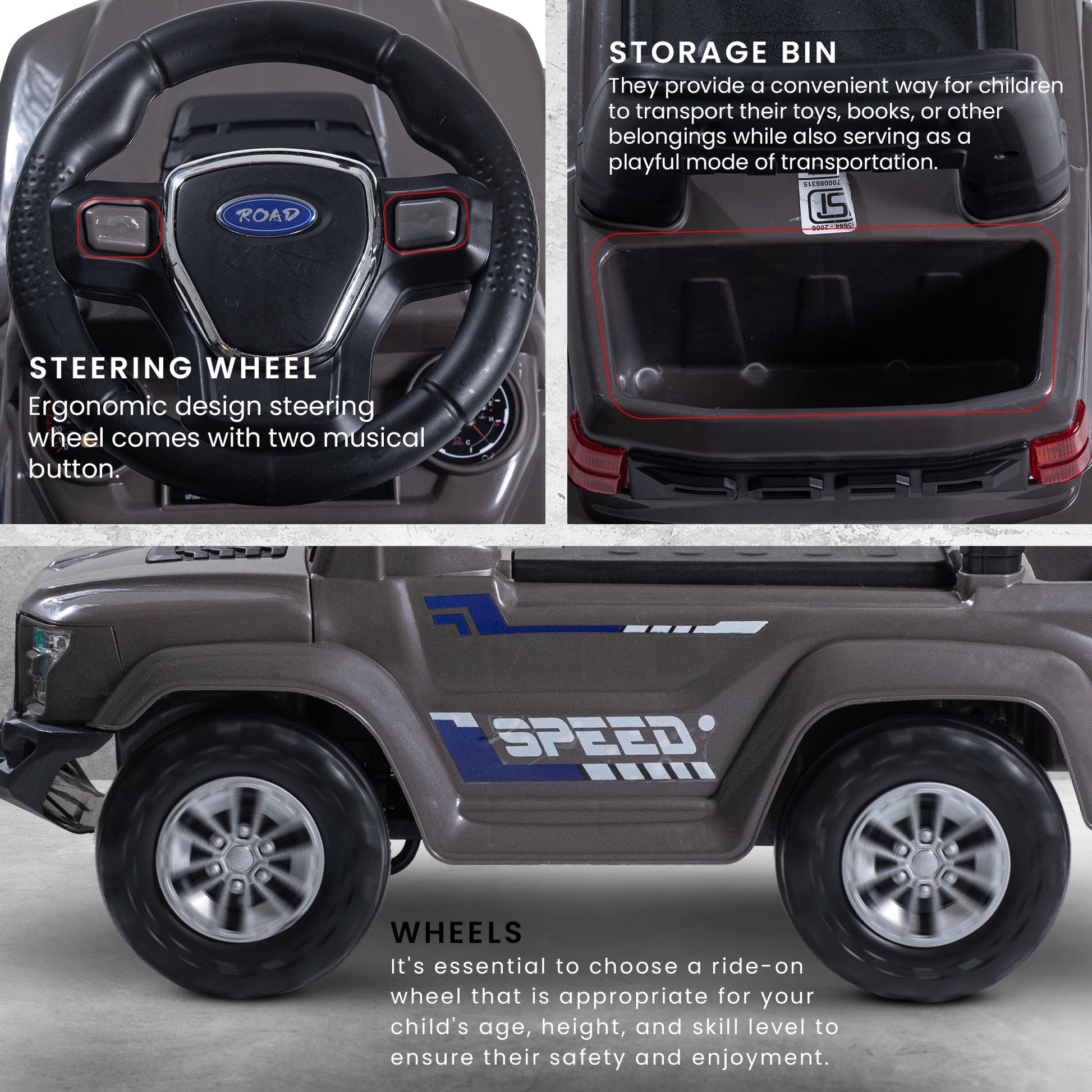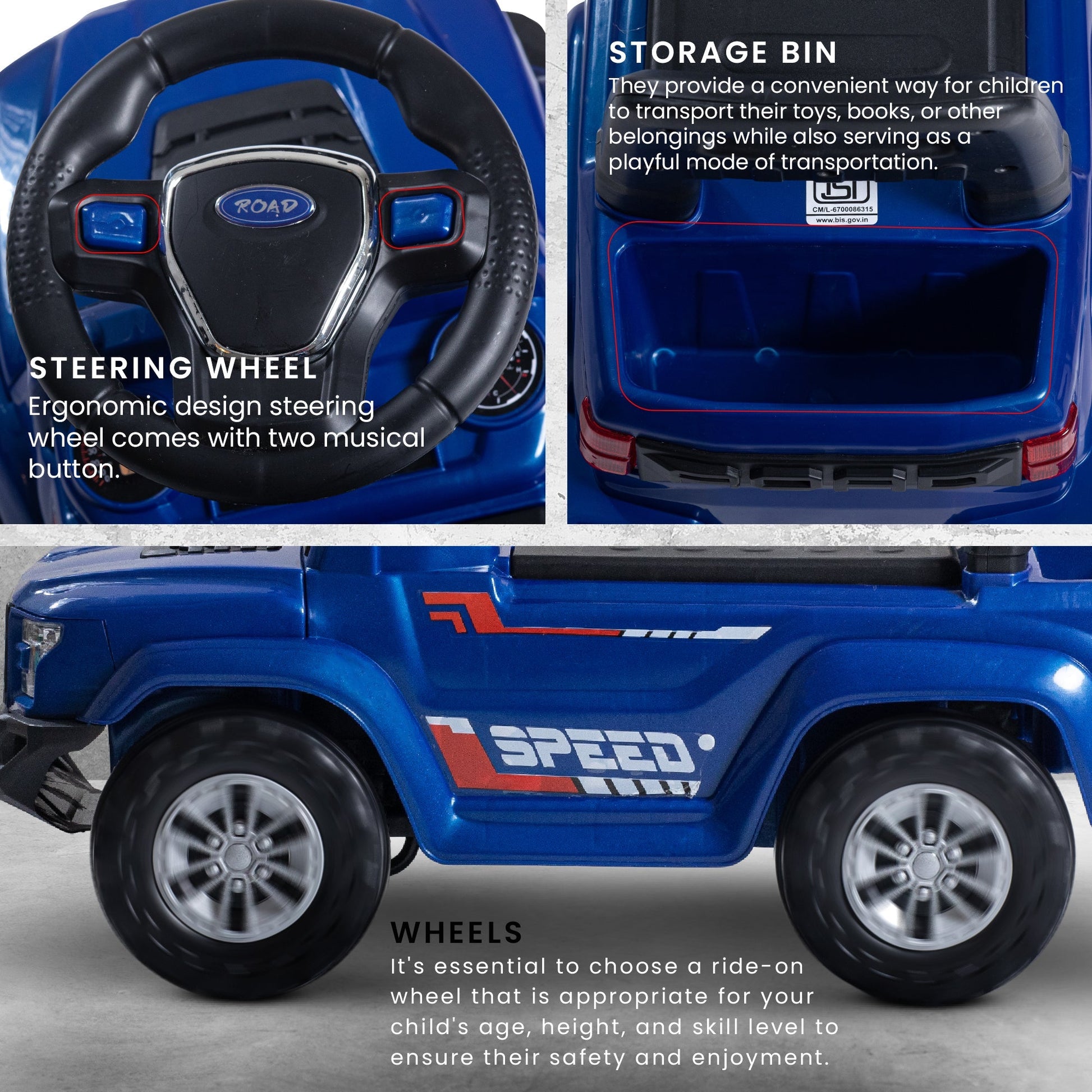 Explore endless possibilities with the Baybee Push Ride on Baby Jeep! Equipped with LED lights and a storage bin, this toy is perfect for imaginative play. Encourage outdoor activity and development of gross motor skills. Let your child's imagination run wild with the Baybee Push Ride on Baby Jeep!