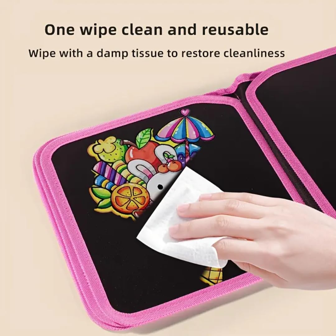 REUSABLE DRAWING PAD - This doodle slate book features 6 erasable black pages that kids can draw on repeatedly using the included washable markers. Simply wipe clean with a damp cloth or the provided cleaning wipes to start again. It is a great way to spark creativity while promoting an eco-friendly habit by reducing paper use and eliminating messy coloring.