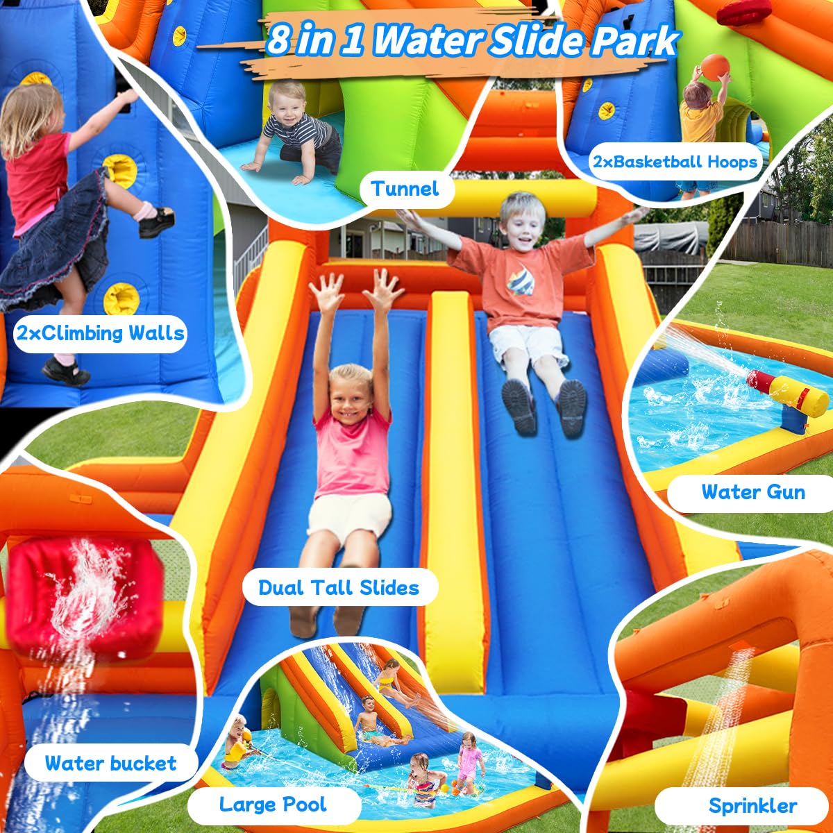 Inflatable Water Slide, Mega Bounce House Water Park with Long Dual Slide, 2 Climbing Walls, 2 Basketball Hoops, Large Splash Pool, 15.6 x 15 x 8.7FT Blow up WaterSlides with Blower