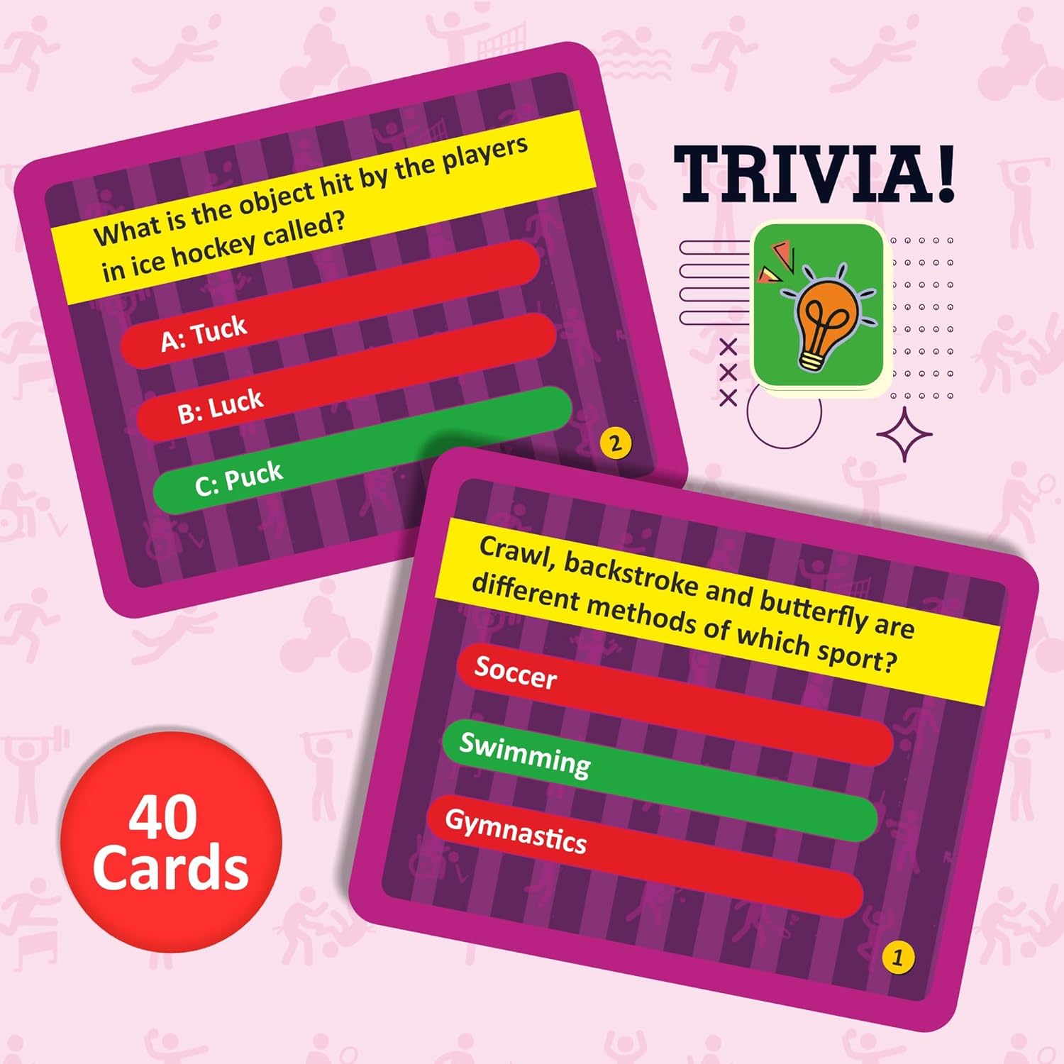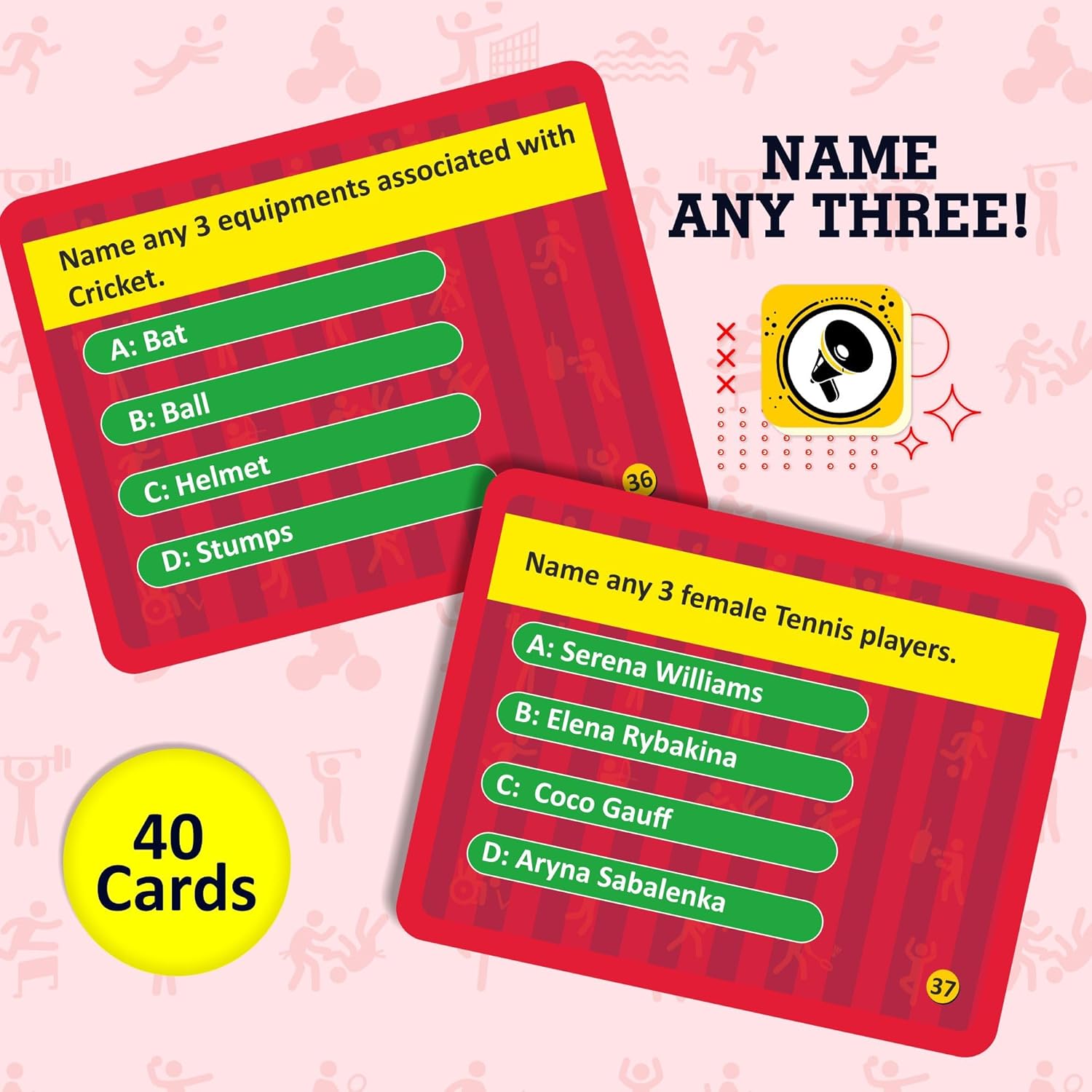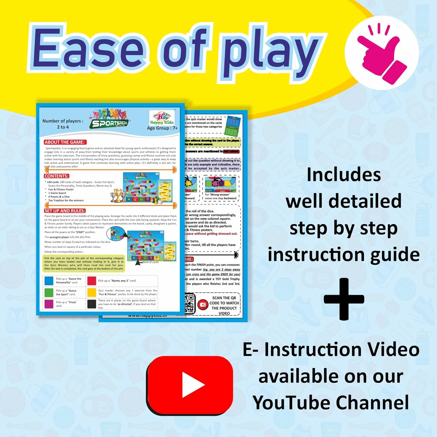 THE PACK INCLUDES: Game Board with 4 pawns and 1 Dice, 2 Fitness Poster, 160 Cards (40-Guess the Personality, 40-Guess the Sports, 40-Name any 3, 40-Trivia), 3 Toy Trophies