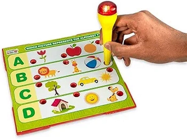 - Place one activity sheet at a time on the base plate or the side of the sheet you want your kid to learn and answer. With the cordless pen tap on the circle adjacent to the answer and watch your child’s face lit with the glow of the pen on each correct answer. That’s it! You’re all set.